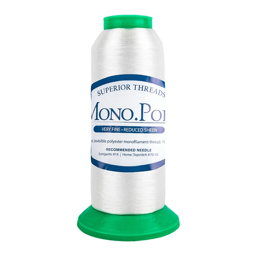 MonoPoly Thread is perfect for quilting and invisible applique. It is a reduced-sheen polyester monofilament invisible thread that will not discolor or become brittle over time. It is iron safe up to medium heat. It is excellent for invisible thread applications and works well on home or longarm quilting machines.