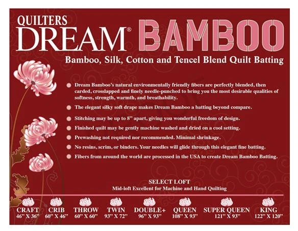 Bamboo Dream Batting by Quilter’s Dream is a finely blended mix of natural fibers that will produce a soft and strong quilt.