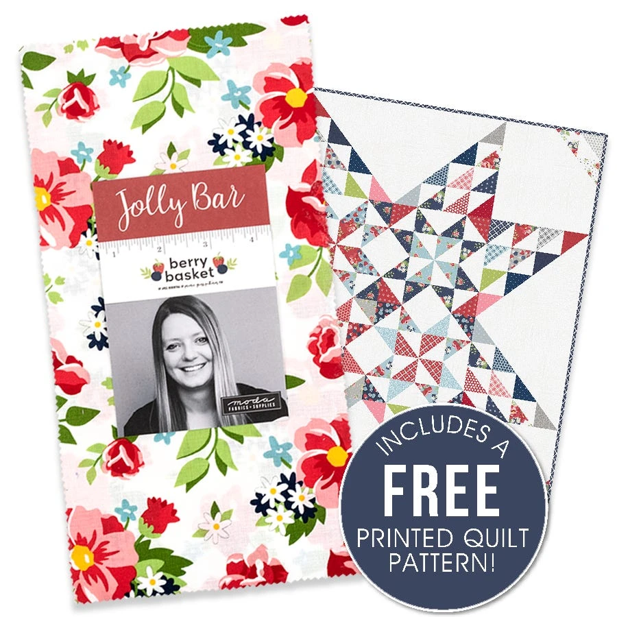 Berry Basket Jolly Bar includes 42 5″ x 10″ cuts of fabric and includes duplicates of some prints. <br><br>Includes a free pattern to make the 64.5″ x 64.5″ quilt. <br><br>Fabric requirements for Berrylicious Jolly Bar Pattern:<BR><ul class=”prod-desc-bullet-list”> <li>One Berry Basket Jolly Bar – SKU# 24150JB</li> <li>3.125 yards background – SKU# 24154-11</li> <li>0.75 yards binding – SKU# 24155-14</li> <li>4.25 yards backing – SKU# 24150-11</li> </ul> <br><br> Pick the very best fruit with this collection by designer <a tabindex=”0″ href=”https://www.fatquartershop.com/april-rosenthal-prairie-grass-patterns-moda-fabrics”>April Rosenthal</a>. <a href=”https://www.fatquartershop.com/moda-fabrics/favorite-things-sherri-and-chelsi-moda-fabrics”>Berry Basket</a> is a very <a tabindex=”0″ href=”https://www.fatquartershop.com/food-fabrics”>berry</a> sweet selection of fabrics full of fun and bright colors, with designs of flourishing <a tabindex=”0″ href=”https://www.fatquartershop.com/floral-fabric”>florals</a> and sweet treats! Pair these prints with the coordinating <a tabindex=”0″ title=”Bella Cottons Solids” href=”https://www.fatquartershop.com/moda-fabrics/bella-solids-moda-fabrics-quilting-fabrics”>Bella Cottons Solids</a> from <a tabindex=”0″ title=”Moda Fabrics” href=”https://www.fatquartershop.com/moda-fabrics”>Moda Fabrics</a> to create some wonderful projects!