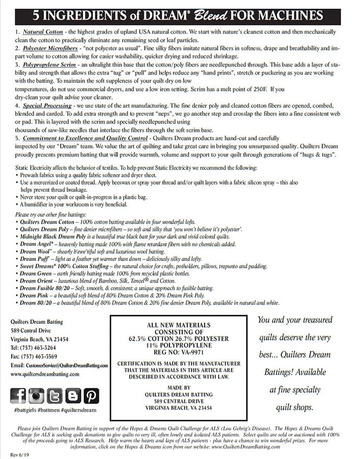 Blend for Machines Batting by Quilter’s DreamFeatures:70% cotton and 30% polyester with Ultra-Light scrim baseNo need to prewash. Shrinkage is minimal.Stitches up to 12″ apart yet remains soft when closely quiltedExcellent for long and short arm machines100% made in the USASize: 60″ x 30 yardsShipping note: This product ships separately from a third party, typically in 5-10 business days. Item cannot be shipped to P.O. boxes, Hawaii, Alaska or outside the contiguous U.S. Also, it cannot be shipped internationally. Not eligible for express shipping.
