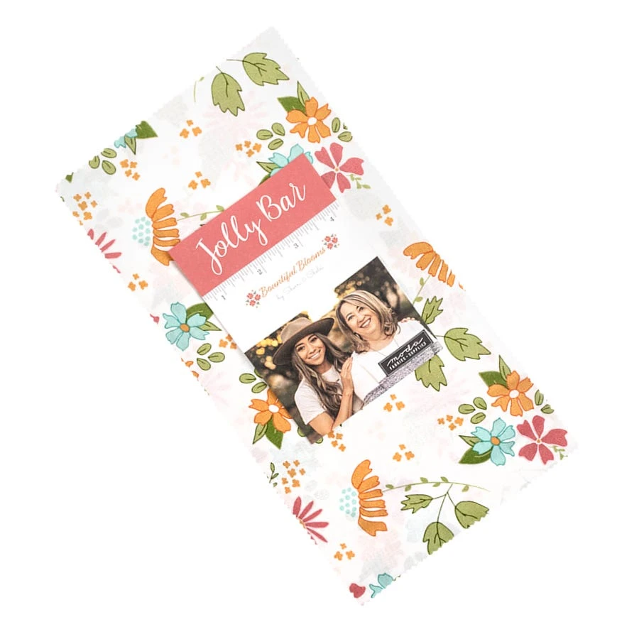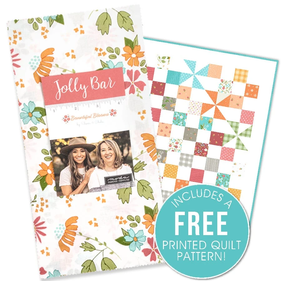 Bountiful Blooms Jolly Bar includes 42 5″ x 10″ cuts of fabric and includes duplicates of some prints <br><br>Includes a free pattern to make the 56.5″ x 56.5″ quilt <br><br>Fabric requirements for Pinwheel Surprise Jolly Bar Pattern:<BR><ul class=”prod-desc-bullet-list”> <li>One Bountiful Blooms Jolly Bar – SKU# 37660JB</li> <li>2.25 yards background – SKU# 37668-21</li> <li>0.625 yards binding – SKU# 37667-18</li> <li>3.75 yards backing – SKU# 37663-11</li> </ul> <br><br> With blooms of plenty and radiating hues, this collection by designers <a tabindex=”0″ href=”https://www.fatquartershop.com/sherri-and-chelsi-for-moda-fabrics”>Sherri & Chelsi</a> is sure to bring a smile to your face. <a href=”https://www.fatquartershop.com/moda-fabrics/bountiful-blooms-sherri-and-chelsi-moda-fabrics”>Bountiful Blooms</a> is filled to the brim with blossoming <a tabindex=”0″ href=”https://www.fatquartershop.com/floral-fabric”>florals</a> and lovely plaid patterns. Pair these prints with the coordinating <a tabindex=”0″ title=”Bella Cottons Solids” href=”https://www.fatquartershop.com/moda-fabrics/bella-solids-moda-fabrics-quilting-fabrics”>Bella Cottons Solids</a> from <a tabindex=”0″ title=”Moda Fabrics” href=”https://www.fatquartershop.com/moda-fabrics”>Moda Fabrics</a> for some bright projects!