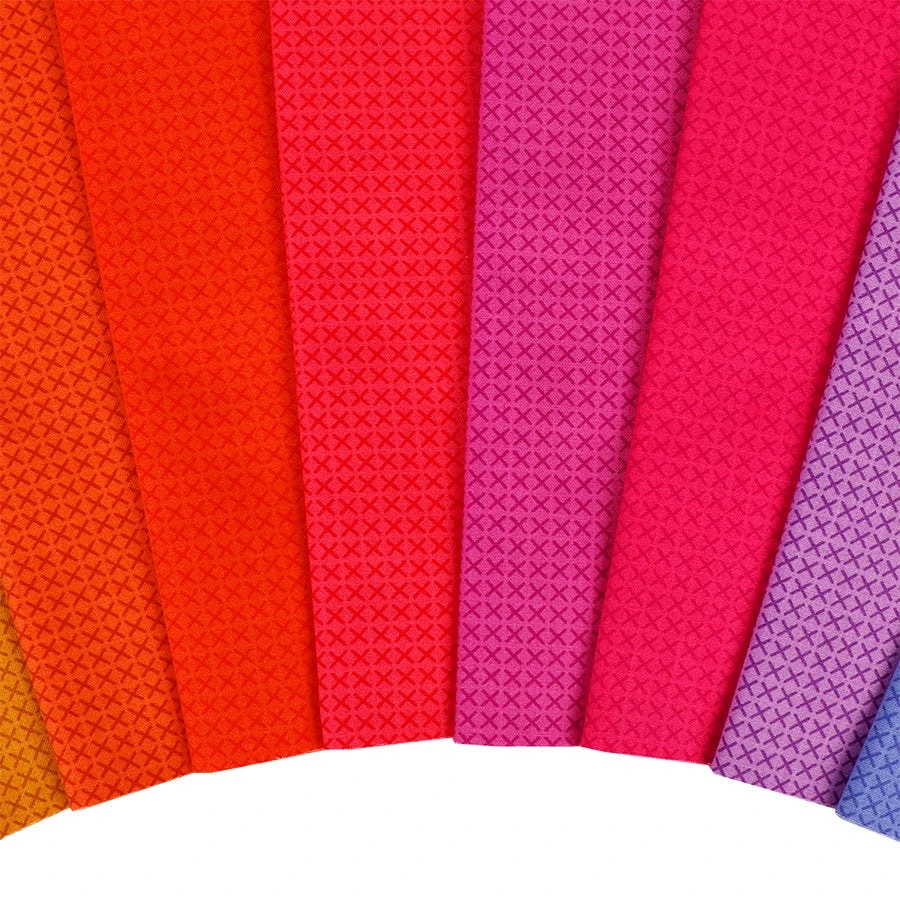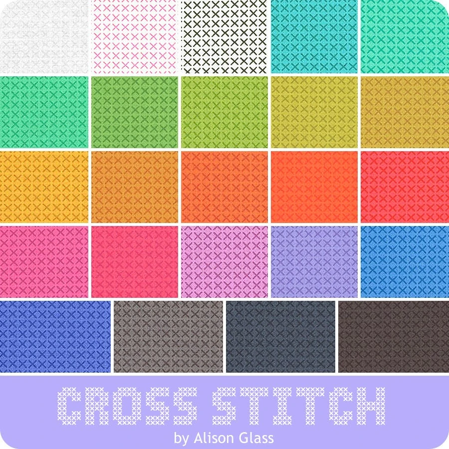 Inspired by little details and her love of color and shape, Alison Glass will keep you in stitches! This bold rainbow of tone on tone cross stitch print makes for a fun textured project or an excellent background. X marks the spot for great quilting!