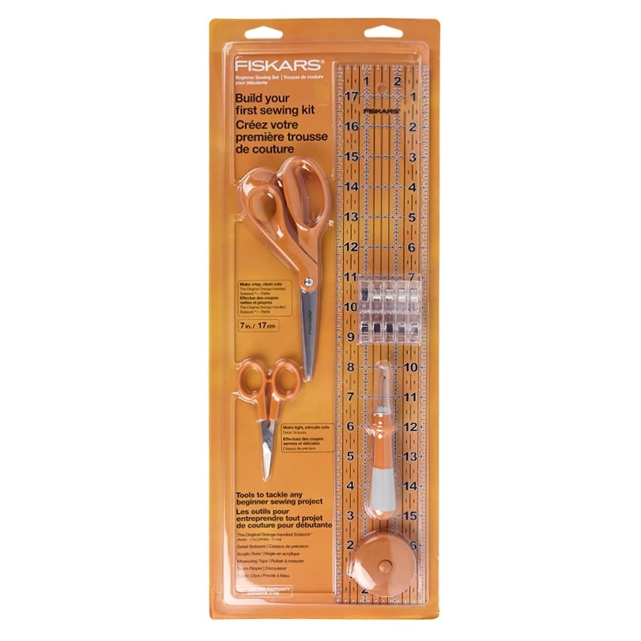 Fiskars Beginner Sewing Set includes the essential tools needed to start sewing. This set comes with six tools that will ensure a simple start to your first project and beyond. The Petite Original Orange-handled Scissors cut sharp lines across your fabric, while the Detail Scissors are perfect for quickly snipping threads and doing detail work. Also included are an Acrylic Ruler, perfect for accurate measurements and even cuts, a Measuring Tape, Fabric Clips and a Seam Ripper.