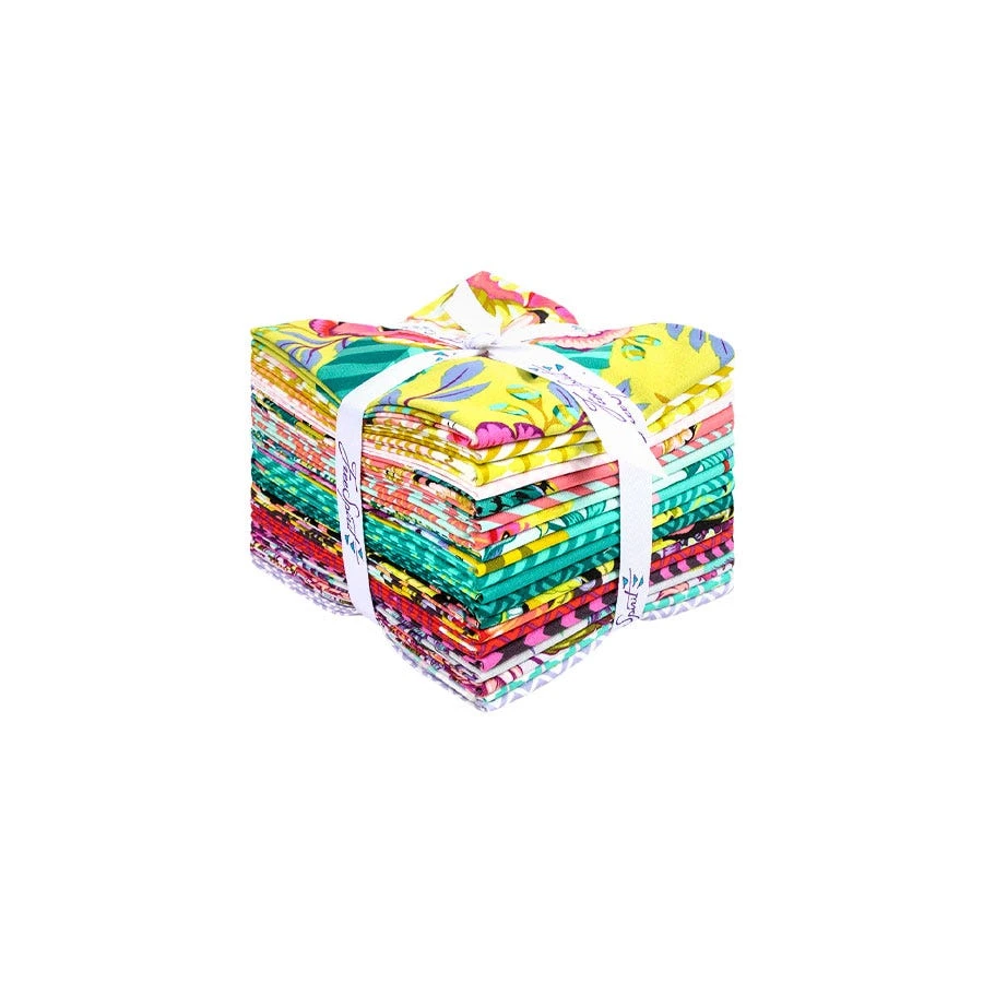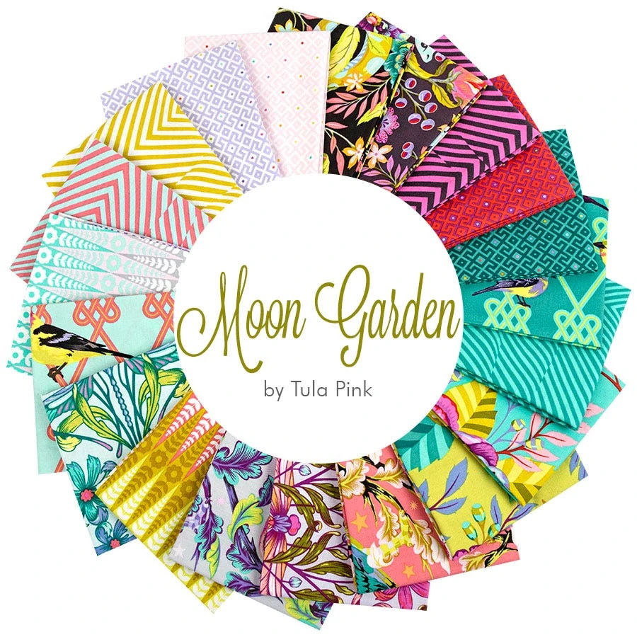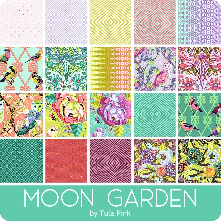 Discover the beautiful glow of Moon Garden, a contemporary collection of nocturnal animals and flowers from Free Spirit Fabrics. Tula Pink paints a vibrant dream of dragonflies in flight and snakes slithering at night, buzzing bees and barn owls in trees, bright berries, sprigs of leaves, finches on fences and geometric hedges to delight the senses in her iconic bright color palette of saturated pink, deep purple, bold green and brilliant teal paired with neutral gray, black and cream hues.