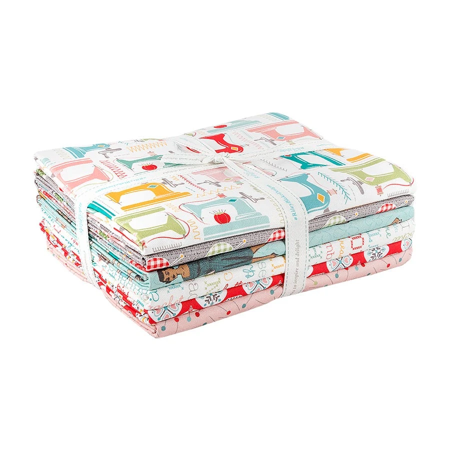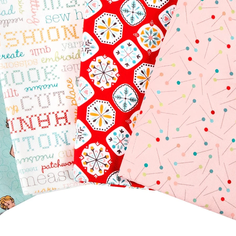 This fun collection has a defined aesthetic with bright colors and it’ll be sure to put you in YOUR happy place. Gray, white, pink and teal prints with lots of sewing machines, pins, pincushions and stitched text straight from Lori Holt! And if you like the fabric in the My Happy Place line, Fat Quarter Shop is proud to offer sewing tins, office sets and other notions included in the same line.