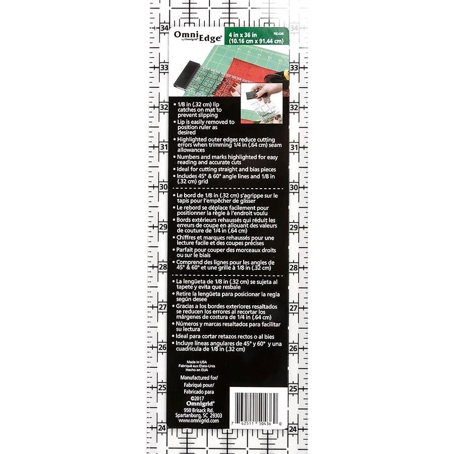 Omnigrid 4″ x 36″ OmniEdge Ruler has a 0.125″ lip that catches onto the edge of your mat to prevent slipping. It is perfect for cutting long strips accurately. It has 1″ grids marked in .125″, .25″ and .5″ increments for easy reading.