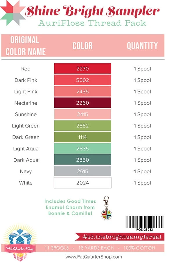 A set of 11 AuriFloss six-strand embroidery floss (18 yards each), hand selected to coordinate with Shine Bright Sampler Quilt and Shine On Sampler Cross Stitch in the Bonnie & Camille Quilt Book.