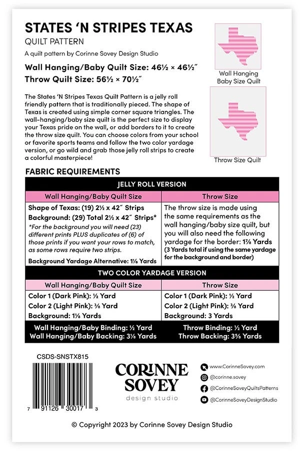 Be the first to review “States ‘N Stripes Texas Quilt PatternCorinne Sovey #CSDS-SNSTX815” Cancel reply
