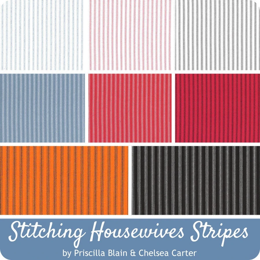 Tight stripes in a colorful range befitting The Real Housewives of Cross Stitch, Priscilla Blain and Chelsea Carter. Build an assortment of flexible stash pieces to adorn the aesthetic of your next Stitching With the Housewives project with these brightly banded prints.