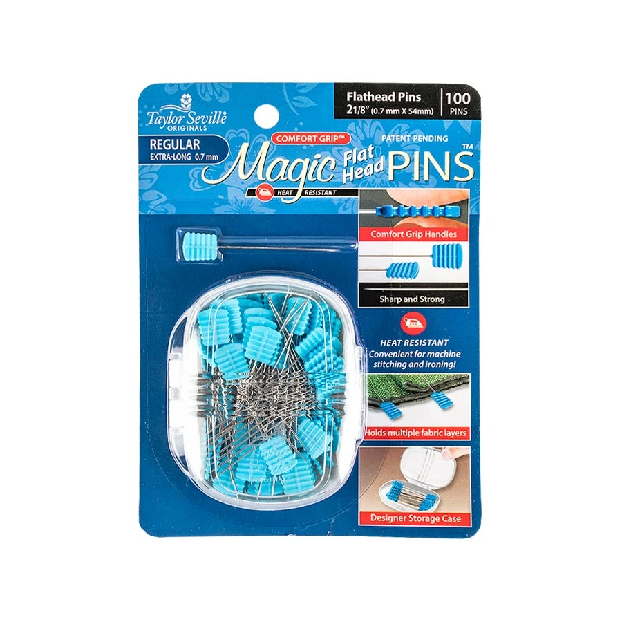 Taylor Seville Regular Flat Head Magic Pins have heat resistant comfort grip handles and are approximately 2.125” long. Package includes storage case and 100 0.7mm magic pins.
