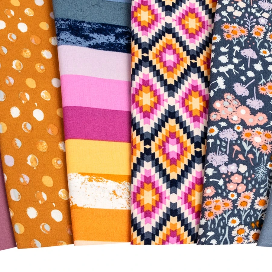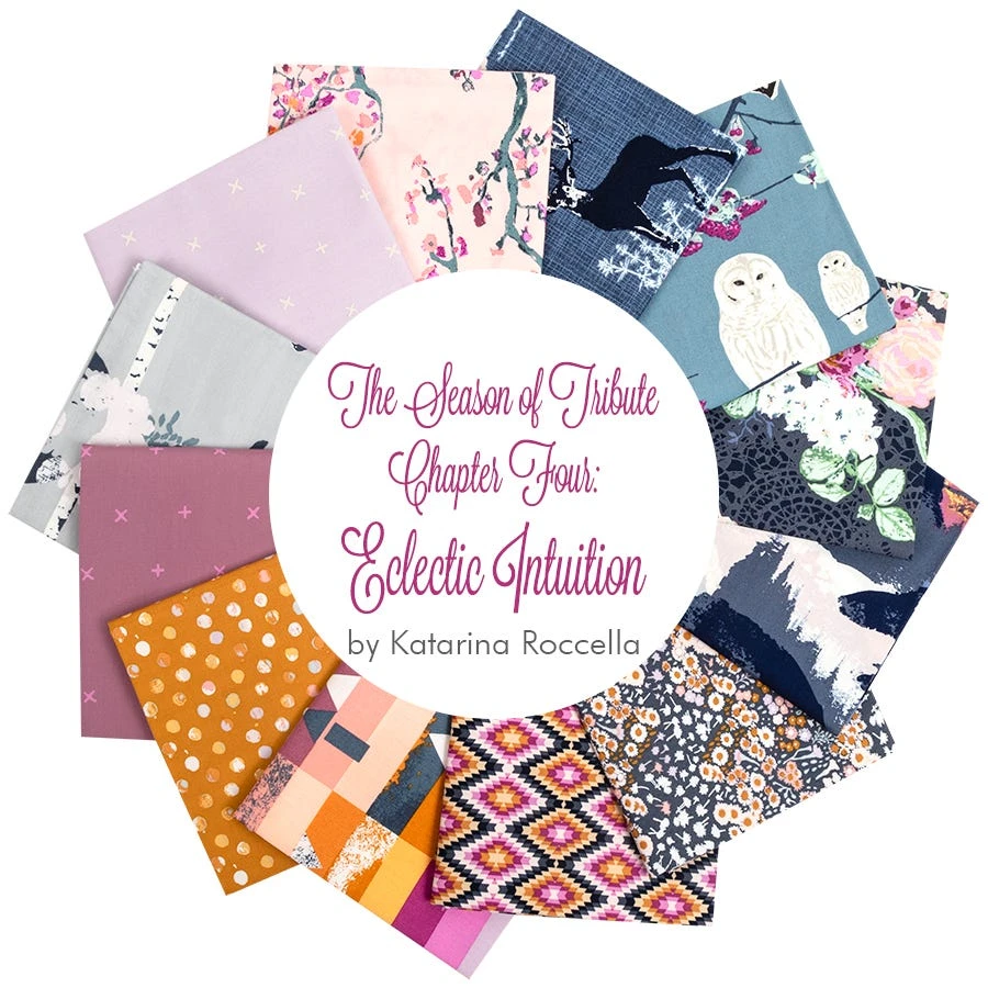 Follow your heart and Eclectic Intuition, Chapter Four of the Season of Tribute series from Art Gallery Fabrics. Curious clouds are brewing above Katarina Roccella’s dreamy landscape of blooming fields featuring boldly painted bouquets, barn owls and bright berries, watchful deer, birds and birch trees, stripes, dots and geometric designs in beautiful black, blue, gray, pink and orange hues.